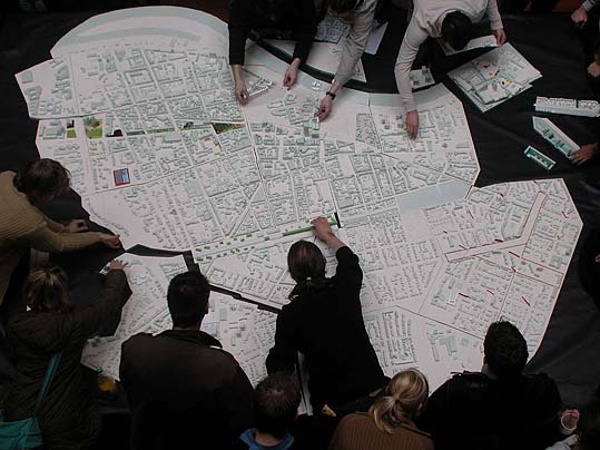 Die zweite Phase steht im Zentrum des Gesamtprojektes und operiert auf unterschiedlichen Ebenen. Im Rahmen eines Planspiels gestalten die Studierenden eine Stadt um – im Sommersemester wird Offenbach Gegenstand der Transformation sein. Ziel der Aufgabe ist es, die entwerferische Kreativität und das Verständnis für geformten Raum zu schulen und erste Schritte im städtebaulichen Entwerfen auf Block- bzw. Quartiersebene zu erproben. Gleichzeitig geht es aber auch darum, zu erkennen, dass Architekten und Stadtplaner in der Gestaltung der räumlichen Umwelt nicht alleine tätig sind. Das Abwägen zwischen eigenen gestalterischen Vorstellungen sowie Interessen der Nachbarn und des Gemeinwesens wird neben der Diskussion innerhalb der Betreuergruppen über das Internet-Forum gelenkt und im Rahmen regelmäßig stattfindender "Parlamentsrunden" im realen Raum (Hörsaal TU Darmstadt) ausgehandelt. | ||